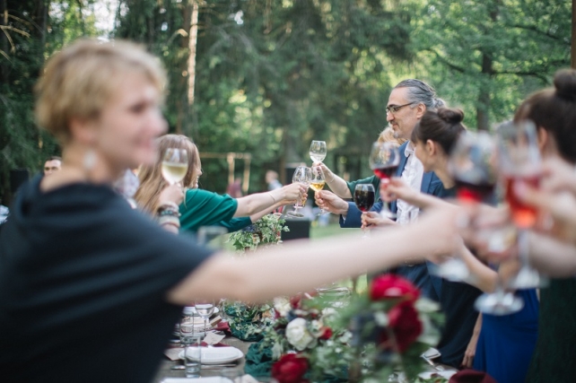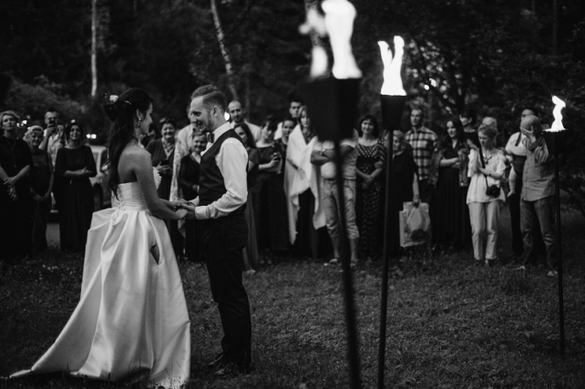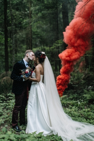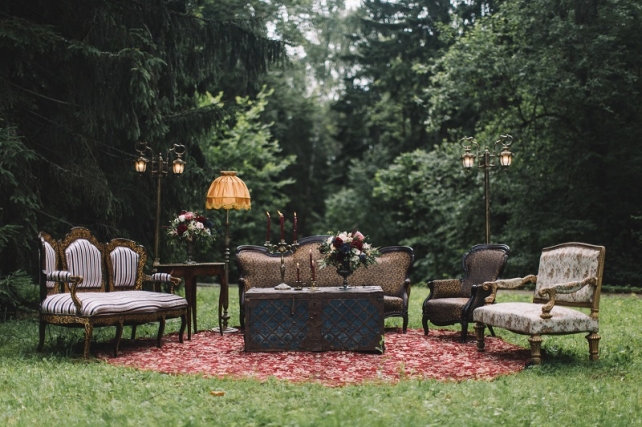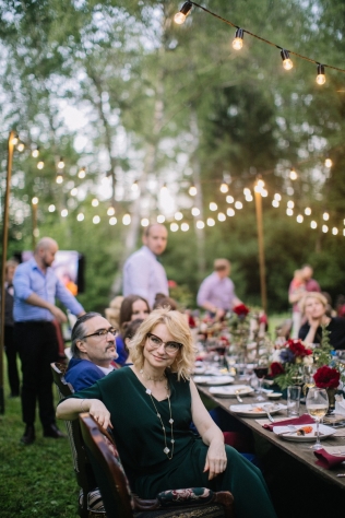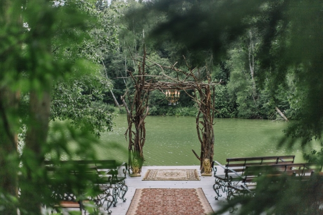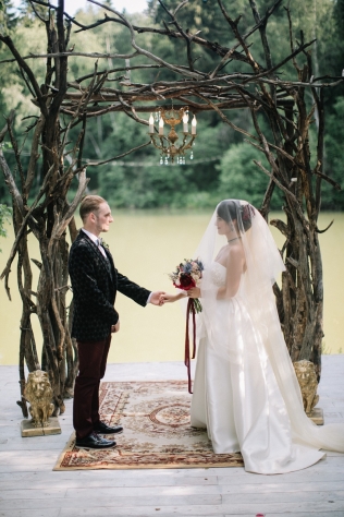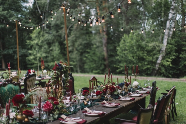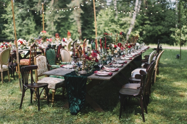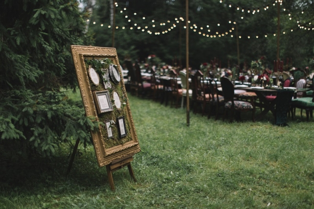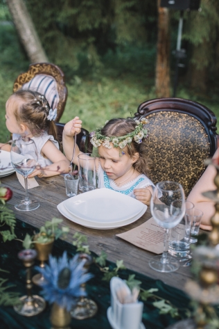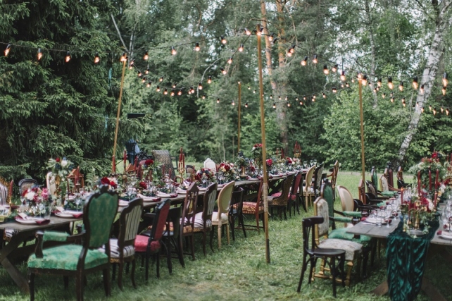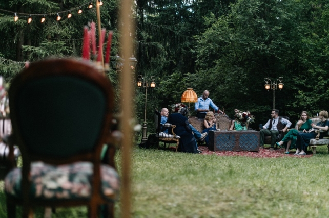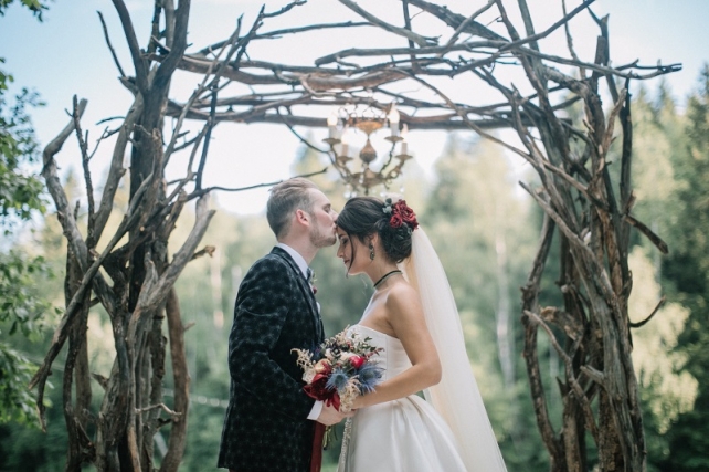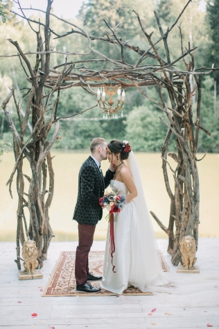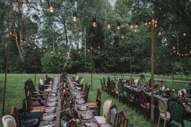 Сохранить 10 При нажатии на кнопку,статья сохранится в разделе"Закладки" в личном кабинете. Поделиться: Сохранить 10 При нажатии на кнопку,статья сохранится в разделе"Закладки" в личном кабинете. Свадьбы Леня и Вика. Богемная свадьба в лесу 03 мая 2017 6316 0 Цвет Бордовый Стиль Богемный стиль Сезон Лето Место Москва Цвет Бордовый Стиль Богемный стиль Сезон Лето Место Москва Декор:Holiday Everyday Фотограф:Александр Мазуров и Анастасия Глебова Эта свадьба — наша абсолютная любовь! В самом начале первой встречи Леня и Вика сказали всего несколько слов: «лес», «барокко», «богема», еще, насколько помним, в разговоре фигурировал Тим Бертон с его «Алисой в Стране чудес» — и дальше понеслась! Ребята начинали что-то говорить, а мы заканчивали, и наоборот! В общем, это было стопроцентное совпадение, взаимопонимание и доверие с первого взгляда.Было очень мало времени для подготовки (меньше месяца), много переживаний из-за погоды, двое суток монтажа в компании комаров, но, несмотря на все сложности, очень хотелось создать лесную сказку, и кажется, у нас получилось!Начать рассказ о свадьбе хочется с образов ребят. Вика была сногсшибательна: готическая барочная принцесса с 6-метровой фатой, бархатным чокером на шее, ярким мейком — все это невероятно ей шло, хотя изначально планировался воздушный образ лесной нимфы. Очень круто, когда внимание жениху уделяется не меньше! У Лени был невероятный бархатный пиджак, да и весь образ был подобран очень гармонично. К слову, ребята работают на «Первом канале», и стилисты, которые создавали образы, их коллеги.Наш самый любимый кадр — Леня и Вика на фоне арки из коряг (куда же без них)), есть в нем какое-то таинство, как будто это портал в неведомый мир, охраняемый золотыми львами! Забавно, что все коряги для конструкции арки в этот лес мы везли из другого, собирали уже на монтаже и изначально не знали, что же у нас получится в итоге.Для праздничного ужина мы подсветили поляну в лесу гирляндами, привезли деревянные столы, но картинка была бы неполной без разных винтажных кресел и стульев, нашей коллекции винтажных подсвечников и ваз, которые отлично вписались в стилистику и придали того самого волшебства. Флористика была дикой и лесной — папоротники, разная зелень, но с яркими акцентами — бордо (любимые пионы ред шарм) плюс насыщенный синий (не менее обожаемые нами ирингиумы). Не обошлось, конечно, и без любимых всеми невестами пионовидных роз.Мы всегда стараемся уделить максимальное внимание деталям: рассадочные карточки были выполнены под заказ из бумаги ручной работы, отлитой из лесных трав, и подписаны каллиграфом, посуда для сервировки, салфетки, свечи — все подбиралось очень тщательно. Также на поляне располагалась лаунж-зона с диванами, креслами, фонарями и торшерами, которые зажглись вечером, а рядом под большими елками на разных старинных столиках располагалась фуршетная и сладкая зона.Как же здорово, что все действие проходило в лесу: не нужно было делать задников, драпировок или что-то прикрывать. Мы считаем, что свадьбы на природе выглядят более естественно и органично. А атмосфера, особенно вечером на поляне, была, и правда, волшебной! С наступлением темноты, под вековыми елями при свете факелов, в присутствии близких людей, ребята обменялись клятвами.Особенно приятно на демонтаже нам было услышать от мамы нев