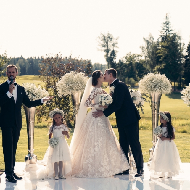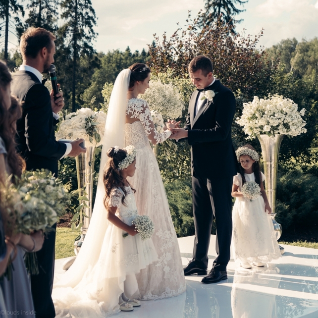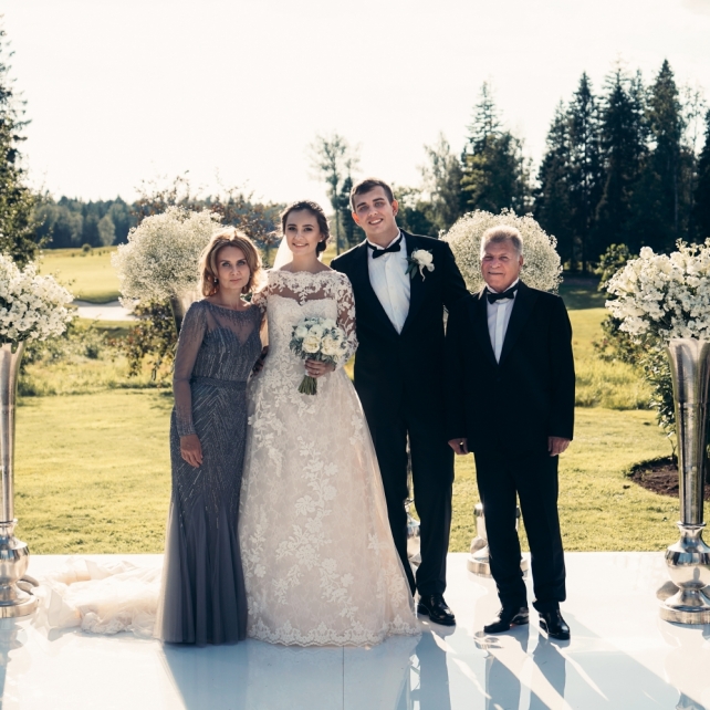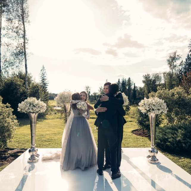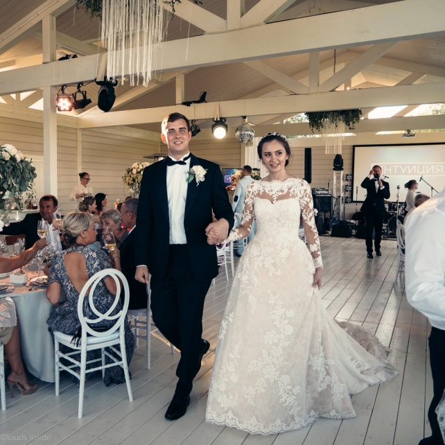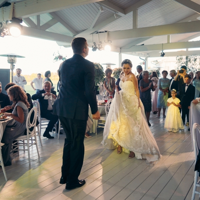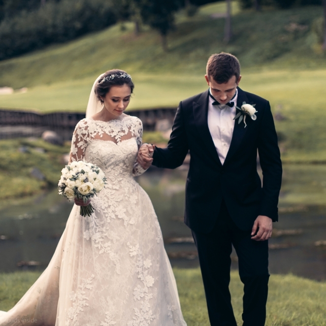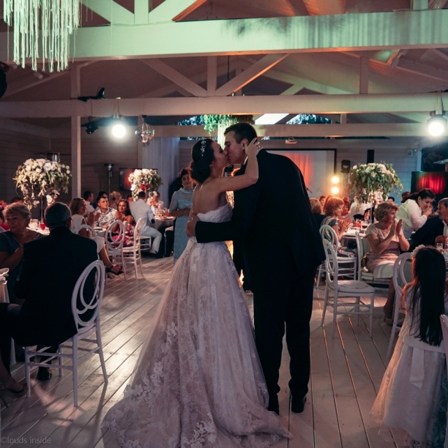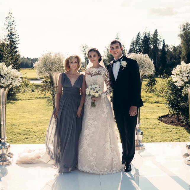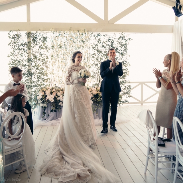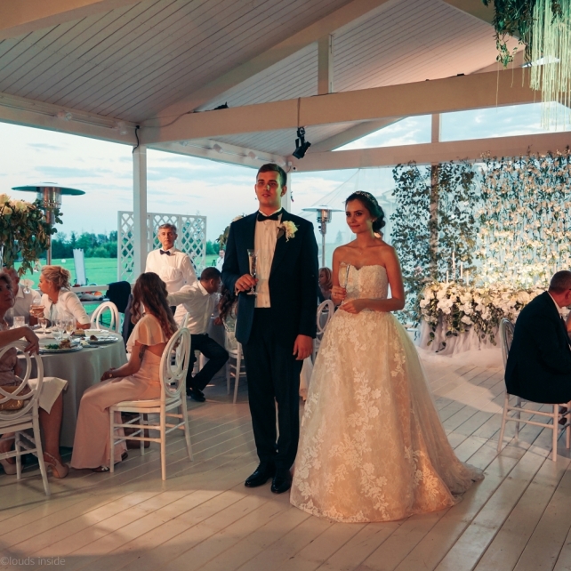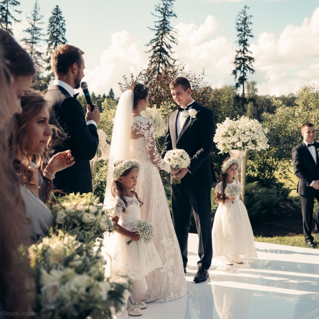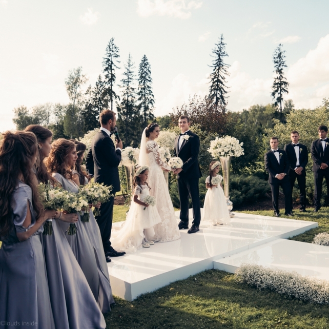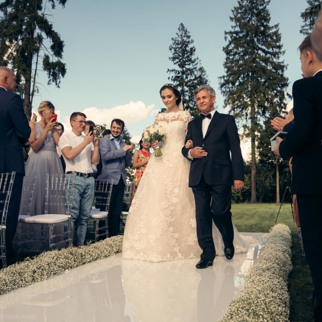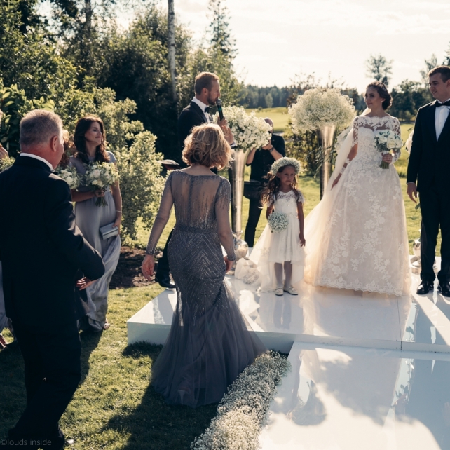 Сохранить 3 При нажатии на кнопку,статья сохранится в разделе"Закладки" в личном кабинете. Поделиться: Сохранить 3 При нажатии на кнопку,статья сохранится в разделе"Закладки" в личном кабинете. Свадьбы Big Classic 27 февраля 2018 3049 0 Цвет Белый Стиль Классика Сезон Лето Место Москва Цвет Белый Стиль Классика Сезон Лето Место Москва Фотограф:Clouds Inside Видеооператор:HRO.MOV video production Платье невесты:Pronovias Свадебный организатор:hbfriends.events Флорист:Зеленая Симфония Знакомство Мы с Никитой познакомились в Академии. 1 сентября 2011 года на торжественной линейке нам выдавали студенческие билеты. Я сразу приметила высокого и симпатичного парня в велюровом пиджаке. Но он был очень серьёзен и как-то не шел на контакт. Поэтому пришлось брать все в свои руки. Увидела, что он заполняет анкету на социальную карту, быстро выбросила свою, заполненную, и подошла поинтересоваться где же он ее взял. После этого началось наше общение, прогулки по ночному городу, разговоры по телефону до утра и романтичные вечера в кафе. Мы как-то сразу поняли, что во многом похожи, у нас общие интересы и одинаковые цели в жизни. На этом и сошлись - две половины одного целого. Предложение 20 декабря я, ничего не подозревая, собиралась на День Рождения мамы. По приезду в ресторан, Никита попросил выйти на улицу, где меня ждал любимый плюшевый медведь Тедди, который передал открытку «Следуй за мечтой!». И сразу на саксофоне заиграла мелодия из нашего любимого фильма, прогремел салют, зажглись буквы в сердечке «Н+Д», а Никита встал на одно колено. До сих пор бегут мурашки, как вспоминаю его дрожащий голос и слегка трясущиеся руки с красной бархатной коробочкой. Да, на тот момент мы жили вместе уже 5 лет, но, тем не менее, было очень неожиданно и волшебно. Затем, на протяжении всей недели были различные сюрпризы: охапка шариков-сердечек утром, семейный ужин в честь помолвки, чудесный большой медведь, салют на берегу озера.Подготовка к свадьбе.Мы решили расслабиться и заняться подготовкой после Нового года. Я не из тех невест, которые заранее представляют, как будет выглядеть свадьба мечты, но фантазия у нас есть и мы с Никитой стали делиться своими мыслями и идеями. К счастью, во многом они были схожи. У нас было четкое понимание того, что мы хотим провести этот важный для нас день на природе, вдали от городской суеты, в окружении самых родных и близких. Для проведения торжества выбрали загородный гольф-клуб «Целеево» - нас устроили расположение, банкетное меню и возможность расселения всех наших гостей, поскольку отмечать мы собирались два дня. Виллы и шале в «Целеево Гольф и Поло Клубе» построены в уютном альпийском стиле, с большим количеством lounge зон, балконами с прекрасным видом, банкетным залом, библиотекой, кинотеатром, каминным залом, бильярдной, сауной и бассейном. А какая красота кругом летом, когда все цветет и гольф-поля поражают своим идеально зеленым и бархатным Грином.В цветовой гамме декора сомнений не было - белый и бело-алюминиевый (серебристый). Стиль - современная классика, в оформлении - только живые цветы. Хотелось чего-то красивого, легкого, но в тоже время - элегантного и торжественного. После выбора места и стиля свадьбы мы приступили к выбору ведущего, фотографа, видеографа, кавер групп, а параллельно ходили на занятия танцами.Платье я приобретала в Барселоне, которая известна оби