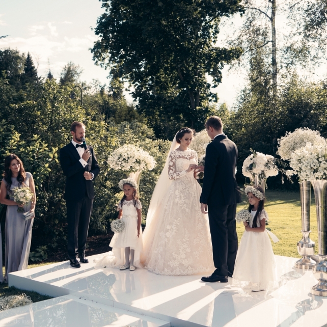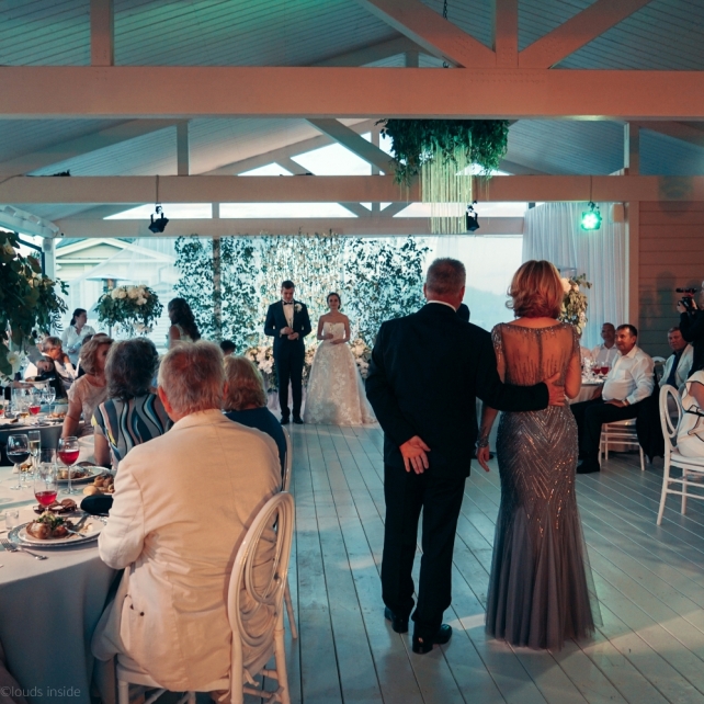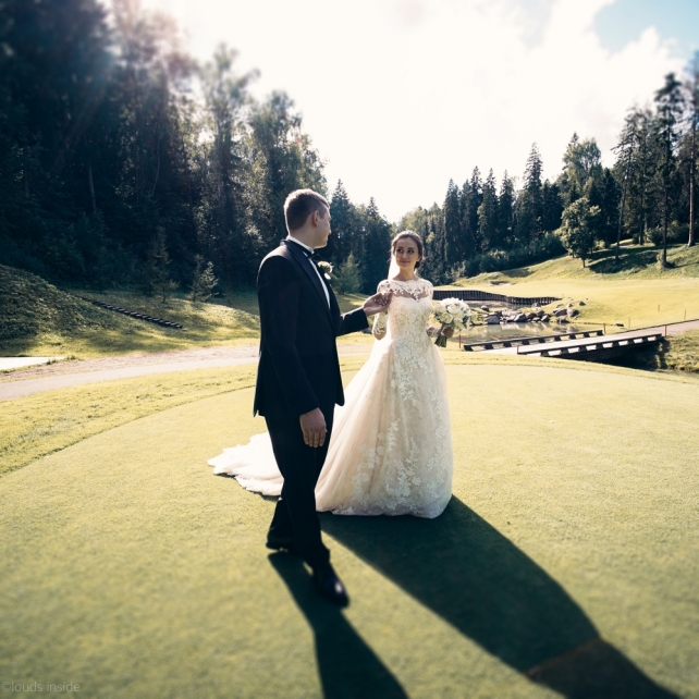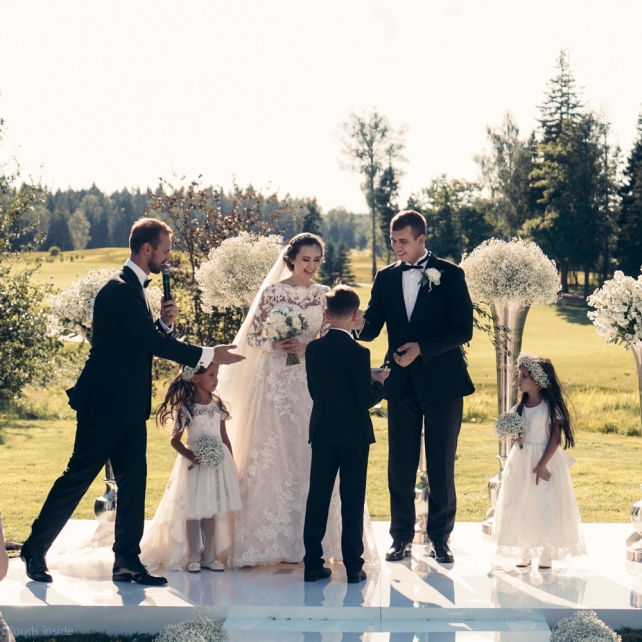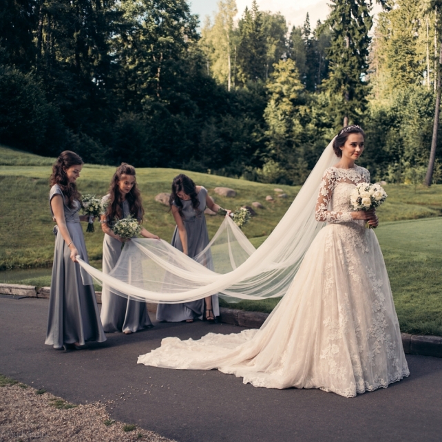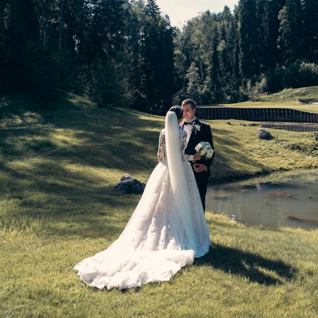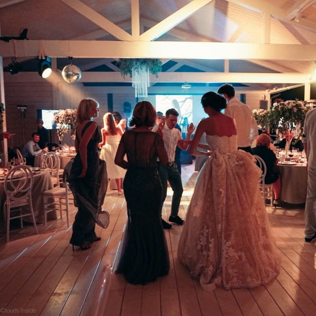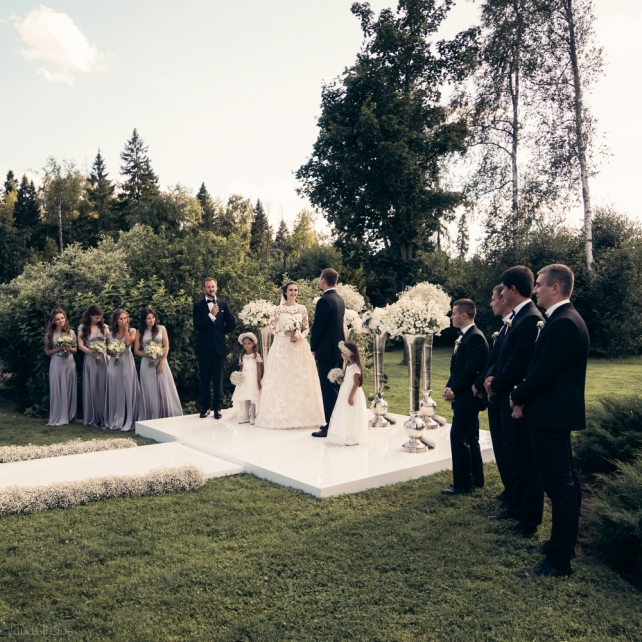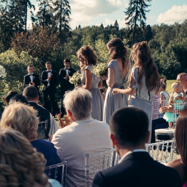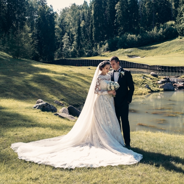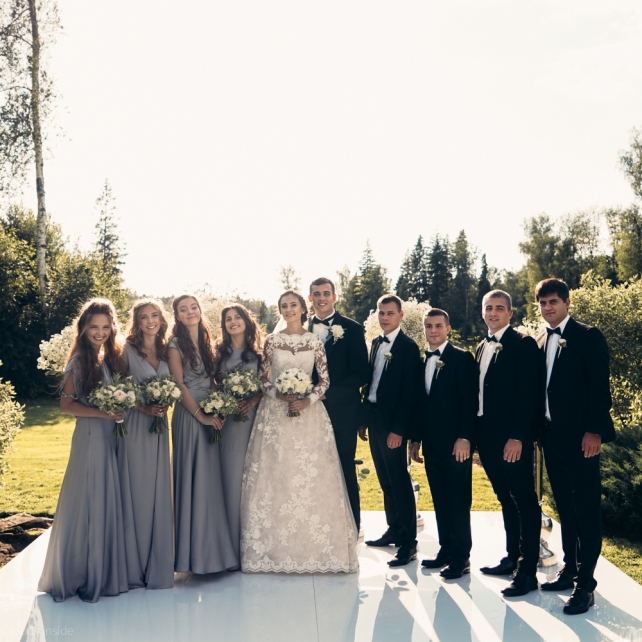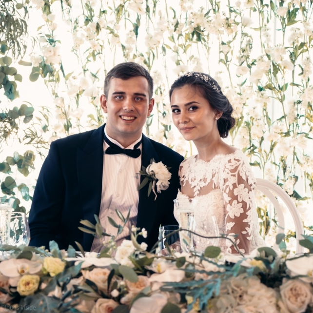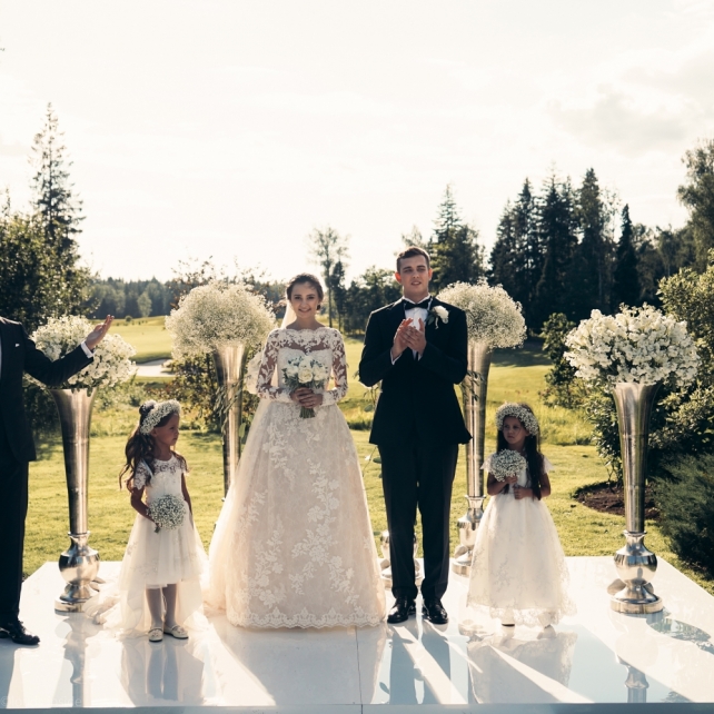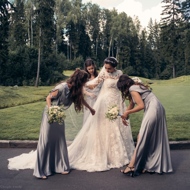 Сохранить 3 При нажатии на кнопку,статья сохранится в разделе"Закладки" в личном кабинете. Поделиться: Сохранить 3 При нажатии на кнопку,статья сохранится в разделе"Закладки" в личном кабинете. Свадьбы Big Classic 27 февраля 2018 3049 0 Цвет Белый Стиль Классика Сезон Лето Место Москва Цвет Белый Стиль Классика Сезон Лето Место Москва Фотограф:Clouds Inside Видеооператор:HRO.MOV video production Платье невесты:Pronovias Свадебный организатор:hbfriends.events Флорист:Зеленая Симфония Знакомство Мы с Никитой познакомились в Академии. 1 сентября 2011 года на торжественной линейке нам выдавали студенческие билеты. Я сразу приметила высокого и симпатичного парня в велюровом пиджаке. Но он был очень серьёзен и как-то не шел на контакт. Поэтому пришлось брать все в свои руки. Увидела, что он заполняет анкету на социальную карту, быстро выбросила свою, заполненную, и подошла поинтересоваться где же он ее взял. После этого началось наше общение, прогулки по ночному городу, разговоры по телефону до утра и романтичные вечера в кафе. Мы как-то сразу поняли, что во многом похожи, у нас общие интересы и одинаковые цели в жизни. На этом и сошлись - две половины одного целого. Предложение 20 декабря я, ничего не подозревая, собиралась на День Рождения мамы. По приезду в ресторан, Никита попросил выйти на улицу, где меня ждал любимый плюшевый медведь Тедди, который передал открытку «Следуй за мечтой!». И сразу на саксофоне заиграла мелодия из нашего любимого фильма, прогремел салют, зажглись буквы в сердечке «Н+Д», а Никита встал на одно колено. До сих пор бегут мурашки, как вспоминаю его дрожащий голос и слегка трясущиеся руки с красной бархатной коробочкой. Да, на тот момент мы жили вместе уже 5 лет, но, тем не менее, было очень неожиданно и волшебно. Затем, на протяжении всей недели были различные сюрпризы: охапка шариков-сердечек утром, семейный ужин в честь помолвки, чудесный большой медведь, салют на берегу озера.Подготовка к свадьбе.Мы решили расслабиться и заняться подготовкой после Нового года. Я не из тех невест, которые заранее представляют, как будет выглядеть свадьба мечты, но фантазия у нас есть и мы с Никитой стали делиться своими мыслями и идеями. К счастью, во многом они были схожи. У нас было четкое понимание того, что мы хотим провести этот важный для нас день на природе, вдали от городской суеты, в окружении самых родных и близких. Для проведения торжества выбрали загородный гольф-клуб «Целеево» - нас устроили расположение, банкетное меню и возможность расселения всех наших гостей, поскольку отмечать мы собирались два дня. Виллы и шале в «Целеево Гольф и Поло Клубе» построены в уютном альпийском стиле, с большим количеством lounge зон, балконами с прекрасным видом, банкетным залом, библиотекой, кинотеатром, каминным залом, бильярдной, сауной и бассейном. А какая красота кругом летом, когда все цветет и гольф-поля поражают своим идеально зеленым и бархатным Грином.В цветовой гамме декора сомнений не было - белый и бело-алюминиевый (серебристый). Стиль - современная классика, в оформлении - только живые цветы. Хотелось чего-то красивого, легкого, но в тоже время - элегантного и торжественного. После выбора места и стиля свадьбы мы приступили к выбору ведущего, фотографа, видеографа, кавер групп, а параллельно ходили на занятия танцами.Платье я приобретала в Барселоне, которая известна оби