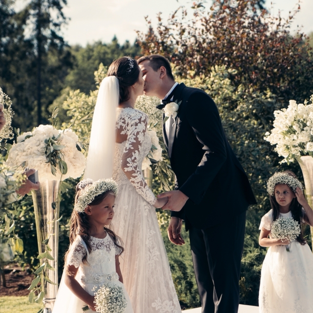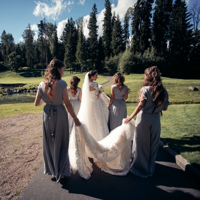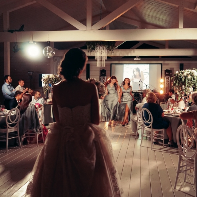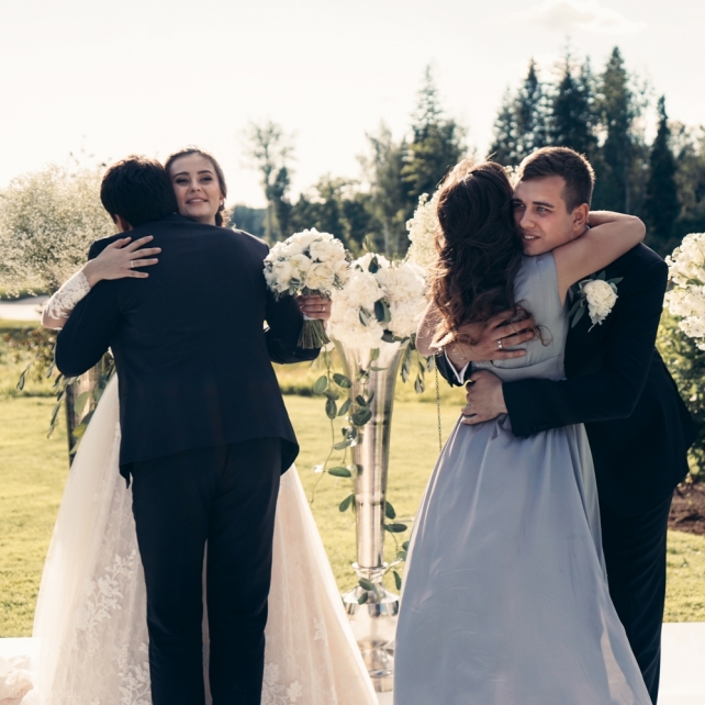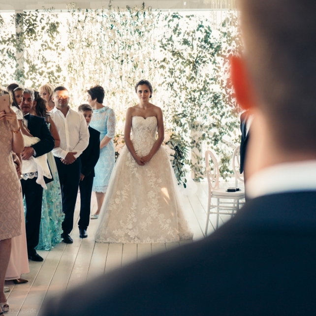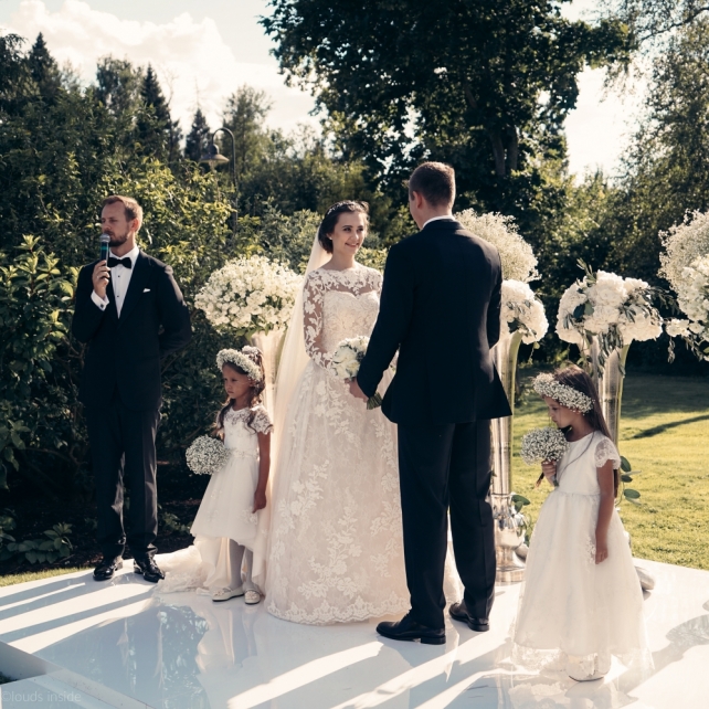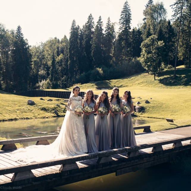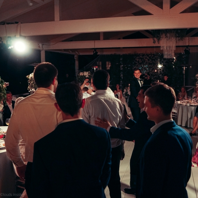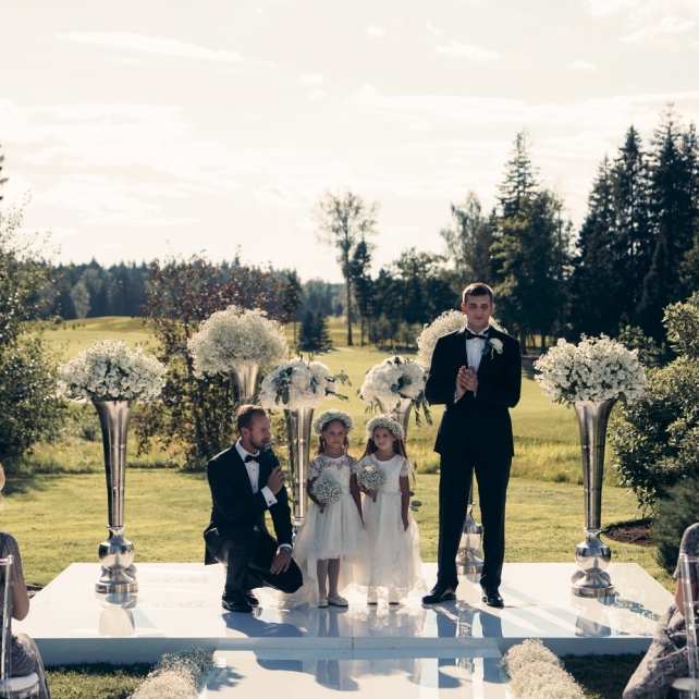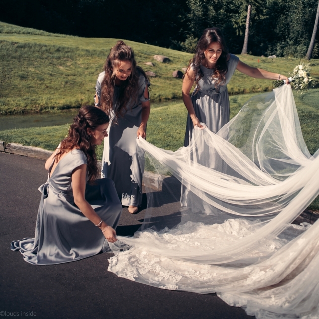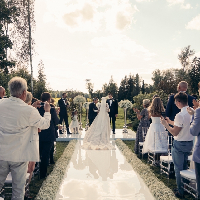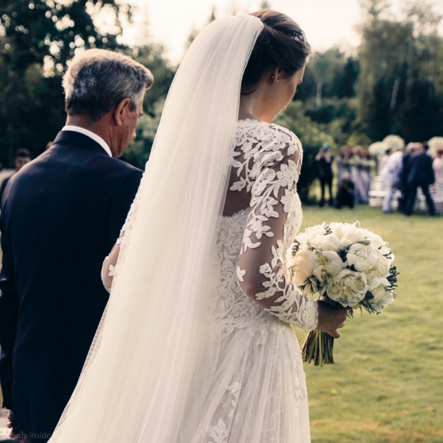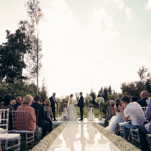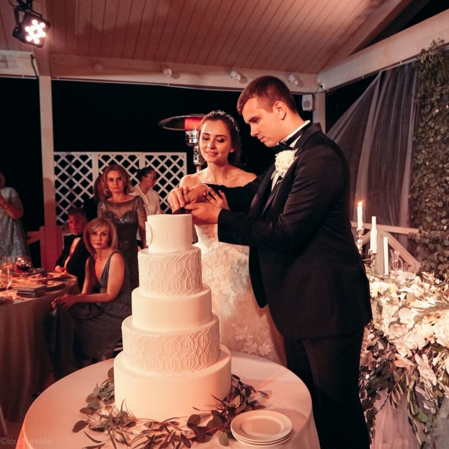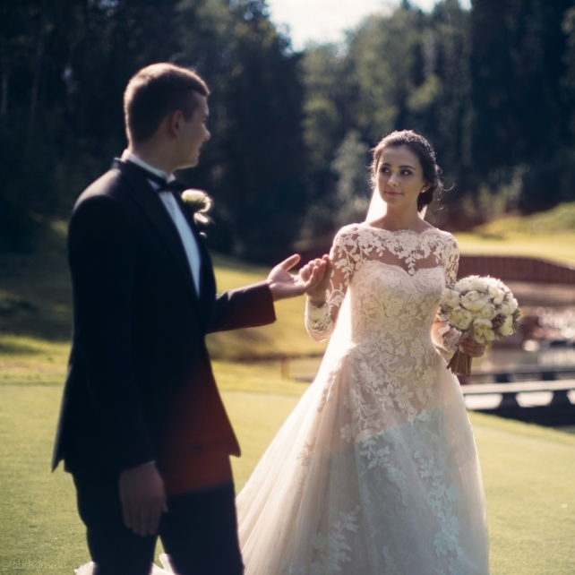 Сохранить 3 При нажатии на кнопку,статья сохранится в разделе"Закладки" в личном кабинете. Поделиться: Сохранить 3 При нажатии на кнопку,статья сохранится в разделе"Закладки" в личном кабинете. Свадьбы Big Classic 27 февраля 2018 3049 0 Цвет Белый Стиль Классика Сезон Лето Место Москва Цвет Белый Стиль Классика Сезон Лето Место Москва Фотограф:Clouds Inside Видеооператор:HRO.MOV video production Платье невесты:Pronovias Свадебный организатор:hbfriends.events Флорист:Зеленая Симфония Знакомство Мы с Никитой познакомились в Академии. 1 сентября 2011 года на торжественной линейке нам выдавали студенческие билеты. Я сразу приметила высокого и симпатичного парня в велюровом пиджаке. Но он был очень серьёзен и как-то не шел на контакт. Поэтому пришлось брать все в свои руки. Увидела, что он заполняет анкету на социальную карту, быстро выбросила свою, заполненную, и подошла поинтересоваться где же он ее взял. После этого началось наше общение, прогулки по ночному городу, разговоры по телефону до утра и романтичные вечера в кафе. Мы как-то сразу поняли, что во многом похожи, у нас общие интересы и одинаковые цели в жизни. На этом и сошлись - две половины одного целого. Предложение 20 декабря я, ничего не подозревая, собиралась на День Рождения мамы. По приезду в ресторан, Никита попросил выйти на улицу, где меня ждал любимый плюшевый медведь Тедди, который передал открытку «Следуй за мечтой!». И сразу на саксофоне заиграла мелодия из нашего любимого фильма, прогремел салют, зажглись буквы в сердечке «Н+Д», а Никита встал на одно колено. До сих пор бегут мурашки, как вспоминаю его дрожащий голос и слегка трясущиеся руки с красной бархатной коробочкой. Да, на тот момент мы жили вместе уже 5 лет, но, тем не менее, было очень неожиданно и волшебно. Затем, на протяжении всей недели были различные сюрпризы: охапка шариков-сердечек утром, семейный ужин в честь помолвки, чудесный большой медведь, салют на берегу озера.Подготовка к свадьбе.Мы решили расслабиться и заняться подготовкой после Нового года. Я не из тех невест, которые заранее представляют, как будет выглядеть свадьба мечты, но фантазия у нас есть и мы с Никитой стали делиться своими мыслями и идеями. К счастью, во многом они были схожи. У нас было четкое понимание того, что мы хотим провести этот важный для нас день на природе, вдали от городской суеты, в окружении самых родных и близких. Для проведения торжества выбрали загородный гольф-клуб «Целеево» - нас устроили расположение, банкетное меню и возможность расселения всех наших гостей, поскольку отмечать мы собирались два дня. Виллы и шале в «Целеево Гольф и Поло Клубе» построены в уютном альпийском стиле, с большим количеством lounge зон, балконами с прекрасным видом, банкетным залом, библиотекой, кинотеатром, каминным залом, бильярдной, сауной и бассейном. А какая красота кругом летом, когда все цветет и гольф-поля поражают своим идеально зеленым и бархатным Грином.В цветовой гамме декора сомнений не было - белый и бело-алюминиевый (серебристый). Стиль - современная классика, в оформлении - только живые цветы. Хотелось чего-то красивого, легкого, но в тоже время - элегантного и торжественного. После выбора места и стиля свадьбы мы приступили к выбору ведущего, фотографа, видеографа, кавер групп, а параллельно ходили на занятия танцами.Платье я приобретала в Барселоне, которая известна оби