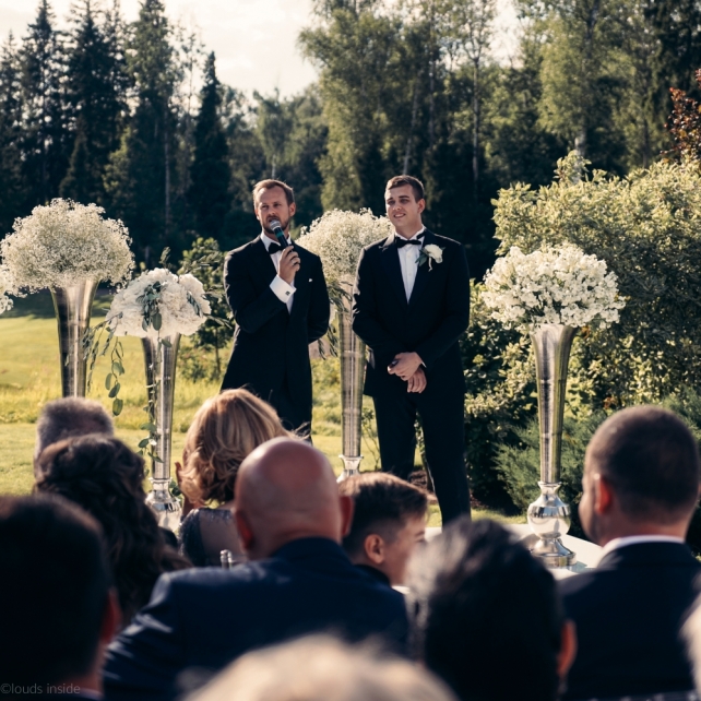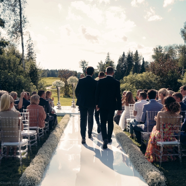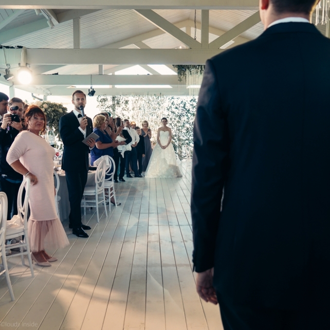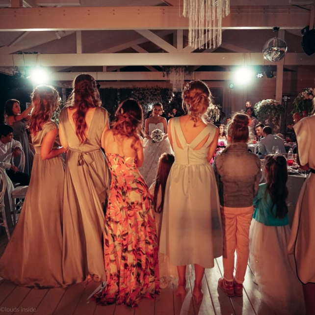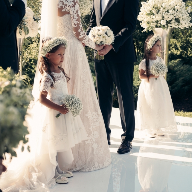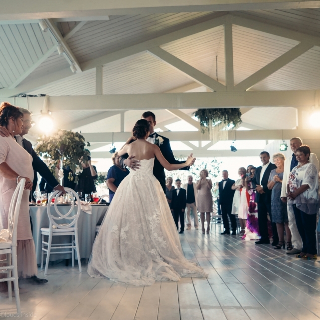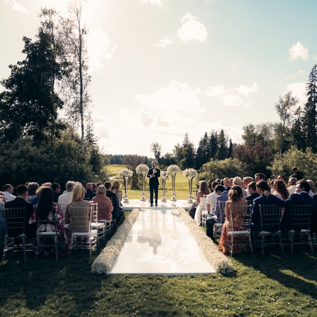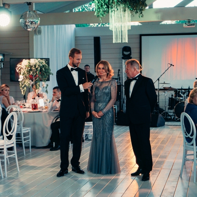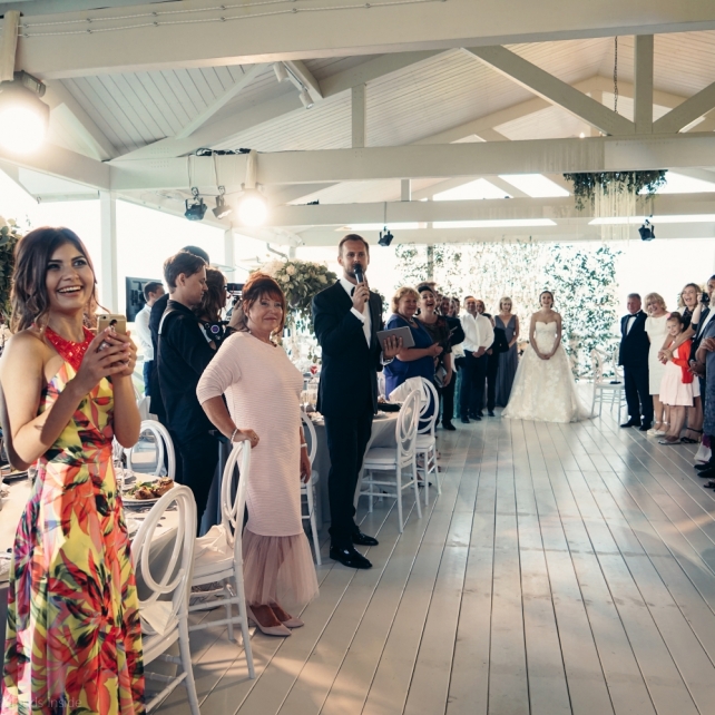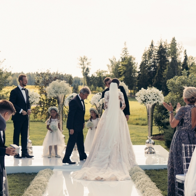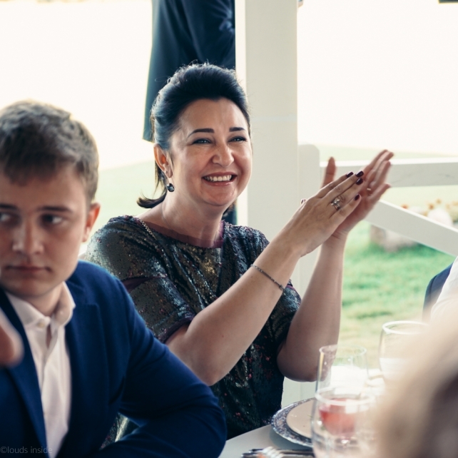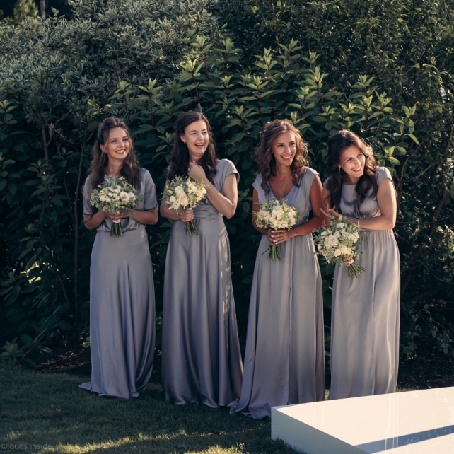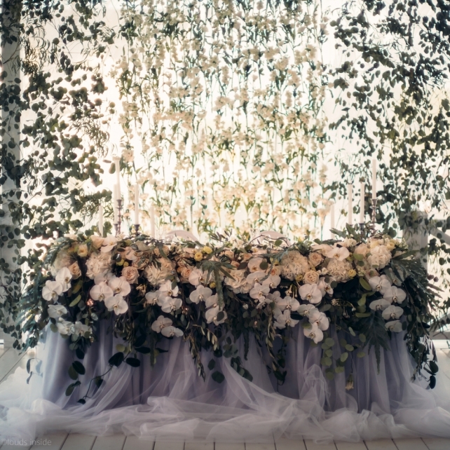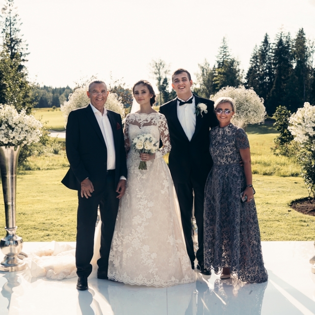 Сохранить 3 При нажатии на кнопку,статья сохранится в разделе"Закладки" в личном кабинете. Поделиться: Сохранить 3 При нажатии на кнопку,статья сохранится в разделе"Закладки" в личном кабинете. Свадьбы Big Classic 27 февраля 2018 3049 0 Цвет Белый Стиль Классика Сезон Лето Место Москва Цвет Белый Стиль Классика Сезон Лето Место Москва Фотограф:Clouds Inside Видеооператор:HRO.MOV video production Платье невесты:Pronovias Свадебный организатор:hbfriends.events Флорист:Зеленая Симфония Знакомство Мы с Никитой познакомились в Академии. 1 сентября 2011 года на торжественной линейке нам выдавали студенческие билеты. Я сразу приметила высокого и симпатичного парня в велюровом пиджаке. Но он был очень серьёзен и как-то не шел на контакт. Поэтому пришлось брать все в свои руки. Увидела, что он заполняет анкету на социальную карту, быстро выбросила свою, заполненную, и подошла поинтересоваться где же он ее взял. После этого началось наше общение, прогулки по ночному городу, разговоры по телефону до утра и романтичные вечера в кафе. Мы как-то сразу поняли, что во многом похожи, у нас общие интересы и одинаковые цели в жизни. На этом и сошлись - две половины одного целого. Предложение 20 декабря я, ничего не подозревая, собиралась на День Рождения мамы. По приезду в ресторан, Никита попросил выйти на улицу, где меня ждал любимый плюшевый медведь Тедди, который передал открытку «Следуй за мечтой!». И сразу на саксофоне заиграла мелодия из нашего любимого фильма, прогремел салют, зажглись буквы в сердечке «Н+Д», а Никита встал на одно колено. До сих пор бегут мурашки, как вспоминаю его дрожащий голос и слегка трясущиеся руки с красной бархатной коробочкой. Да, на тот момент мы жили вместе уже 5 лет, но, тем не менее, было очень неожиданно и волшебно. Затем, на протяжении всей недели были различные сюрпризы: охапка шариков-сердечек утром, семейный ужин в честь помолвки, чудесный большой медведь, салют на берегу озера.Подготовка к свадьбе.Мы решили расслабиться и заняться подготовкой после Нового года. Я не из тех невест, которые заранее представляют, как будет выглядеть свадьба мечты, но фантазия у нас есть и мы с Никитой стали делиться своими мыслями и идеями. К счастью, во многом они были схожи. У нас было четкое понимание того, что мы хотим провести этот важный для нас день на природе, вдали от городской суеты, в окружении самых родных и близких. Для проведения торжества выбрали загородный гольф-клуб «Целеево» - нас устроили расположение, банкетное меню и возможность расселения всех наших гостей, поскольку отмечать мы собирались два дня. Виллы и шале в «Целеево Гольф и Поло Клубе» построены в уютном альпийском стиле, с большим количеством lounge зон, балконами с прекрасным видом, банкетным залом, библиотекой, кинотеатром, каминным залом, бильярдной, сауной и бассейном. А какая красота кругом летом, когда все цветет и гольф-поля поражают своим идеально зеленым и бархатным Грином.В цветовой гамме декора сомнений не было - белый и бело-алюминиевый (серебристый). Стиль - современная классика, в оформлении - только живые цветы. Хотелось чего-то красивого, легкого, но в тоже время - элегантного и торжественного. После выбора места и стиля свадьбы мы приступили к выбору ведущего, фотографа, видеографа, кавер групп, а параллельно ходили на занятия танцами.Платье я приобретала в Барселоне, которая известна оби