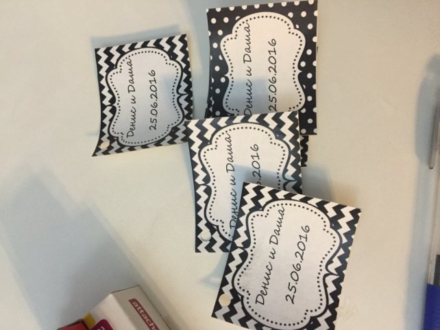 Про подарки гостям Блоги 02 августа 2016 1225 0 Daria Сохранить 1 Поделиться: Сохранить 1 Наконец-то я смогу рассказать о своём творческом участии в подготовке свадьбы! Ура!Начну я с того, что подарков гостям - бонбоньерок или чего-либо похожего - мы не готовили. Это было решением жениха, достаточно категоричным. В принципе, его мнение нашло поддержку среди наших родителей, поэтому, я спорить не стала. Но вопрос все таки проработала :) Наши декораторы предлагали нам в фотокоре расположить ящик, в котором стояли бы горшочки с суккулентами (это растение такое) в качестве подарков. Интересно, но не все поймут. Или магниты с каким-либо символом нашей свадьбы. Были у меня так же съедобные варианты, лично мне они нравились больше всего. Это были и баночки варенья/мёда, шоколадки в обертках, сделанными по нашему эскизу, стандартные бонбоньерки с конфетами, макаруны или печенья в цветах свадьбы. Я даже смогла найти наиболее выгодные варианты!!! Но аргументы жениха были следующими: для некоторых съедобных сувениров слишком жарко (в день нашей свадьбы было +32), баночки можно разбить... Я уже воспользовалась последним вариантом - благодарственные карточки! Но услышала твёрдое "нет". Решила послушаться, так как мой дорогой уже был женат, опыта у него побольше.Следующей задачей стали сувениры за участие в конкурсах. Это должно быть что-то не очень дорогое, но при этом то, что не будет совсем уж дешёвкой и абсолютной бесполезностью. Если честно, я очень долго думала сама, не могла придумать ничего. Все опять съедобное в голову лезло. Пристала с вопросом к ведущему и организаторам, в качестве идеи были предложены сертификаты! Жениху идея понравилась :) преступили к исполнению. Придумали тексты к 20 сертификатам, что-то примерно такое:Обладатель данного сертификата имеет право на один поход в кино с молодожёнамиДалее я купила красивую бумагу, как раз 20 листов, печатала на ней. К сожалению во время печати произошла неприятность, на части сертификатов уехал текст, пачка бумаги была в магазине последней... Пришлось искать выход! Скачала похожий фон в интернете, подложила под текст и печатала. Наверное, так стоило делать изначально, чтобы избежать проблем. Но все случилось, как случилось. Вариант очень не затратный, учитывая даже тот факт, что не у всех есть принтеры. Есть специальные конторы (в Москве около каждого метро), где цветная печать стоит 10-15 рублей за лист.Сертификаты стали у нас основным призом за участие в конкурсах, но мы ещё купили конфеты на палочках, чтобы раздавать в тех конкурсах, где важно правильно ответить на один из вопросов или просто поучаствовать без победителя (в коробке было 24 конфеты, от конкурсов они остались, покупали в оптовом магазине, подучилось дёшево).Кроме конкурсов "за сертификаты" ведущий предложил провести несколько конкурсов с другими призами. В одном из них гости должны были угадывать предметы, первая буква названия которых совпадает с одной из букв фамилии жениха. На все буквы мы смогли придумать небольшие покупки, кроме буквы А. Ну вот кроме автомобиля ничего толкового не выходило!!! В итоге, мы купили деревянную модель автомобиля (в магазине с товарами для всех видов хобби) и раскрасили его сами акриловыми красками:) Ещё один конкурс - угадать что у ведущего в коробке. А там находится предмет, связанный, например, с профессией жениха