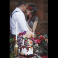 Выбранный стиль декора - Богемный стиль - был несколько смягчен для гармонизации всей атмосферы в сторону "русского" формата: вместо экзотических цветов - розы, георгины, ягоды калины, ежевики, брусники и смородины, мох и ветки сосны. Вместо ловушек для снов - кружево в деревянных пяльцах. Все было построено на контрастах: дерево и ткань, простые винные бутылки и роскошные подсвечники, сочный цвет декора, и, конечно, перья. В качестве места проведения был выбран эко-комплекс, дом сложенный целиком из бревен, с камином и просторным двором - уютный и очень колоритный. Деревянные столы со скамейками вместо стульев, множество свечей, бабушкина кружевная скатерть и простая керамическая посуда служили декором. В меню ужина были традиционные продукты с неожиданным вкусом - мастерски приготовленные приглашенным шеф-поваром азиатского ресторана с добавлением экзотических кисло-сладких соусов и с необычной подачей. Сладкий стол с ежевичным и черничным вареньем из семейных запасов, а торт для ребят сделала мама жениха, секретный рецепт которого обещала передать невесте. После неповторимого ужина, веселых интерактивов, и игр гостям долго не хотелось расходиться - тепло горящего камина, только близкие люди и ощущение "особенного дня" - что может быть лучше?
