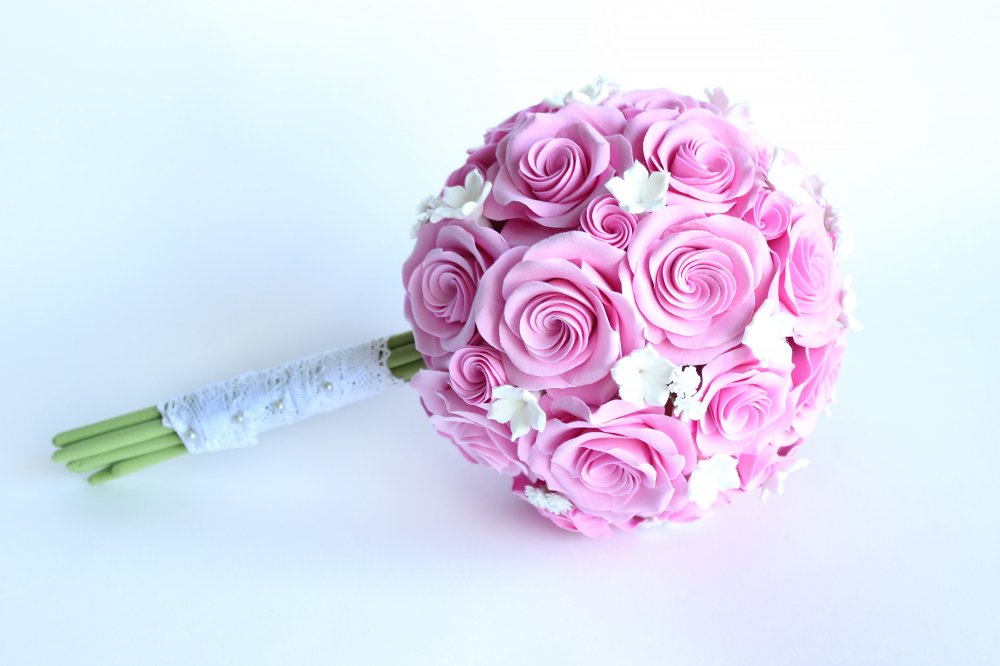 Нежный букет для нежной невесты) В составе букета чудесные викторианские розы и белоснежные стефанотисы. Все цветы ручной работы из полимерной глины DECO. Стебли декорированы кружевной лентой. Возможно другое оформление лентами по Вашему пожеланию.