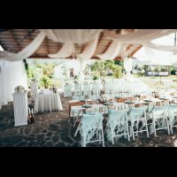Потолок над банкетной зоной украшен легкими "парусами" из вуали и хрустальными люстрами.