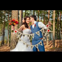 Красно-белая сердечная свадьба Дмитрия и Ольги, жених и невеста держат в руках гирлянду из флажков