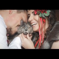 Бордовая свадьба в стиле бохо, жених и невеста с котиком