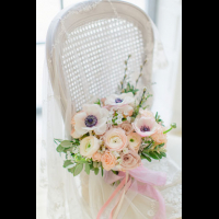 Утро невесты в нежных пастельных тонах, букет невесты на классическом стуле