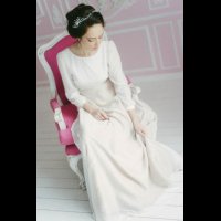 Шифоновое платье молочно бежевых оттенков, с летящей струящейся юбкой, с нежным верхом в горошек и открытой спиной. Скромный и милый образ.
