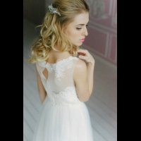 Нарядное платье нежно персикового оттенка, с кружевным узором на мягкой сетке, с фатиновой воздушной юбкой. Красивый и утонченный образ.