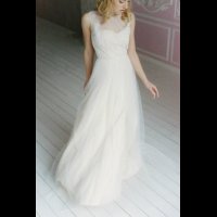 Нарядное платье нежно персикового оттенка, с кружевным узором на мягкой сетке, с фатиновой воздушной юбкой. Красивый и утонченный образ.