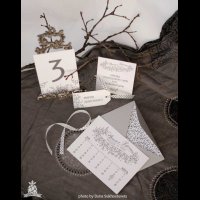 В комплект входит конверт с цветной подложкой и двухсторонняя карточка-приглашение, номерок на стол, именная карточка рассадки гостя, благодарственная карточка.