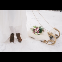 Зимняя прогулка невесты в лесу, невеста с санками
