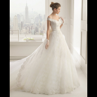 Платье из кружева с камнями и шантильи, с широким поясом из тафты, цвет натуральный.