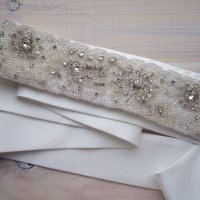 Свадебный пояс 'Chiny Cristals' из атласа цвета айвори, расшитый россыпью кристаллов, бисером и стеклярусом. Благодяря такому декору пояс выглядит очень нарядно и торжественно.