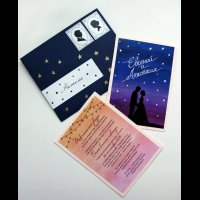 Приглашения для пары (как и другая полиграфия) выдержаны в звездной тематике, а силуэты на них - реальные профили невесты и жениха. отрисованые художником.