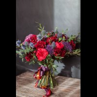 яркий букет, красный, пионовидные розы пиано ред, зимний сезон