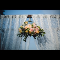 Декор арки выездной регистрации, оформленная кружевом и цветочной композицией в клетке.