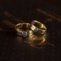 Обручальные кольца из золота 750 пробы, с православной молитвой, нанесённой внутри и снаружи колец. Мужское кольцо украшает большой цейлонский сапфир, весом чуть менее карата, в женском кольце натуральный голубой бриллиант, весом 0,2 карата.