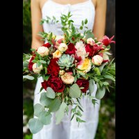 Букет невесты из бордовых и кремовых английских роз Дэвида Остина Тэсс и Беатрис, бордовых садовых роз Вонтед, белых кустовых пионовидных роз Латин Помпон и красных орхидей Цимбидиум с белой брунией Блашинг Брайд и эхевериями