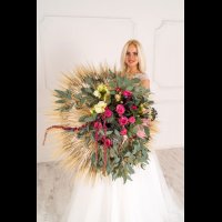 Каркасный букет из роз, орхидей и калл с протеей и эхевериями
