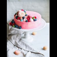 Нежный Йогуртовый торт ,украшенный капельками из меренги ,розовыми бутонами роз и россыпью свежих ягод.
