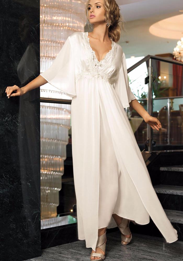 Описание: длинный полупрозрачный легкий халат-кимоно прямого силуэта с V-образным вырезом. Халат завязывается на пояс.