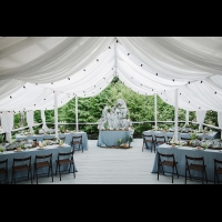 Панорамный вид веранды. На столах гостей нестандартные композиции.