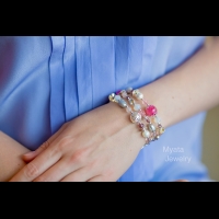 Трехъярусный браслет из коллекции CANDY. Создан с использованием натуральных камней: розового агата, речного жемчуга, лунного камня, розового кварца, стеклянных бусин, с эксклюзивной металлической фурнитурой, на застежке тогл. Длина 17 см.