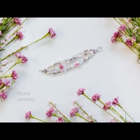 Трехъярусный браслет из коллекции CANDY. Создан с использованием натуральных камней: розового агата, речного жемчуга, лунного камня, розового кварца, стеклянных бусин, с эксклюзивной металлической фурнитурой, на застежке тогл. Длина 17 см.