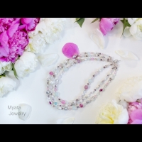 Украшения из коллекции CANDY созданы с использованием натуральных камней: розового агата, речного жемчуга, лунного камня, розового кварца, стеклянных бусин, а также цепочек, подвесок и эксклюзивной металлической фурнитуры. Длина ожерелья 50 см.