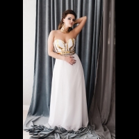 Роскошное белое платье " Клеопатра" в греческом стиле. Платье украшено золотыми пластинками, бисером и пайетками. Юбка двухслойная:верх из шифона, внутренняя - атлас на подкладе. Размер 44-46 . Стоимость проката 1800руб. на 2-3 дня.