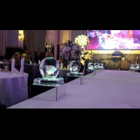 Ледяные шары в зеркальных поддонах с розой внутри для украшения подиума.