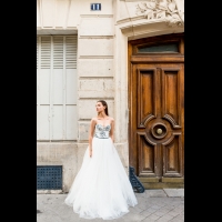 Великолепное свадебное платье-бюстье с богатой инкрустацией бисером, жемчугом и камнями в сочетании с ажурной вышивкой подчёркивает роскошное декольте.