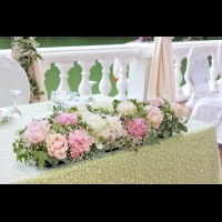 Полевая свадьба в Снегирях, композиция на стол для гостей - эвкалипт, гипсофила, пионы, хедера