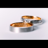 Обручальные колечки из двух цветов золота с отпечатками пальцев на внутренней стороне.