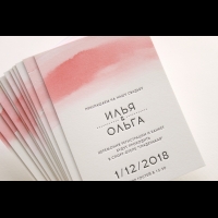 Для этих приглашений было решено использовать нанесение акварели вручную, чтобы каждая карточка получилась неповторимой. Простые гротесковые шрифты уравновешивают нежность акварели.