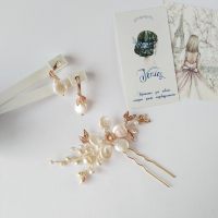 Комплект состоит из шпильки с жемчугом и серьгами в одном стиле.