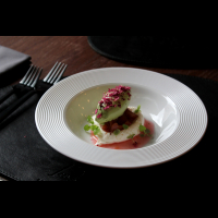 Крем - козий сыр, мороженое - щавель и сметана, ревень, роза