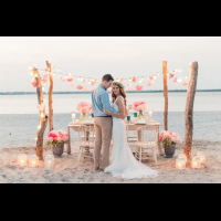 пляжная свадьба, стол для молодоженов на закате