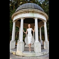 Свадебное платье "Николина", цвет молочный, размер 44. Перламутровая ткань, плечи и глубокий вырез на спине украшены крупными камнями.