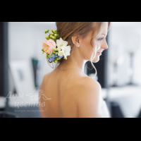 Состав букета: пионовидная роза, фрезия, гиперикум, гортензия.