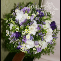 Состав букета: эустома, фрезия, лимониум, хризантема.