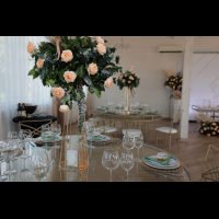 оформление стола, гостевая композиция, центральная композиция, золото и персиковый, оформление зала