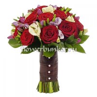 Состав: роза гран при 15шт., фрезия 9шт., лизиантус белый 5шт., салал, декор.