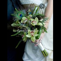 Состав: Букет на своих ногах,  перья павлина 5шт., удл. для цветка, цимбидиум 5кол., эвкалипт, аспидистра, вероника,  скиммия, декор.