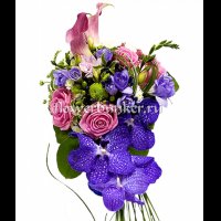 Состав: калла, роза, орхидея ванда, фрезия, хризантема кустовая, берграсс, портручка, дек. материалы.