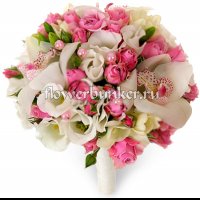 Состав: орхидея цимбидиум, лизиантус, фрезия, роза кустовая, портручка, декор.