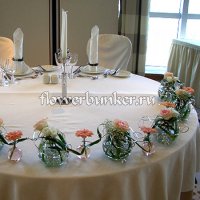 Состав: 7 больших ваз, 6 маленьких ваз, гербера розовая, лизиантус белый, гипсофила, роза розовая, декор.