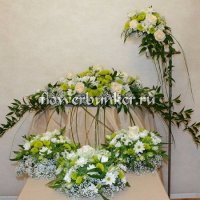 Состав: роза Талея, хризантема кустовая белая-зеленая, лизиантус белый, гипсофила, рускус ит., рускус изр., берграсс, оазис, декор.